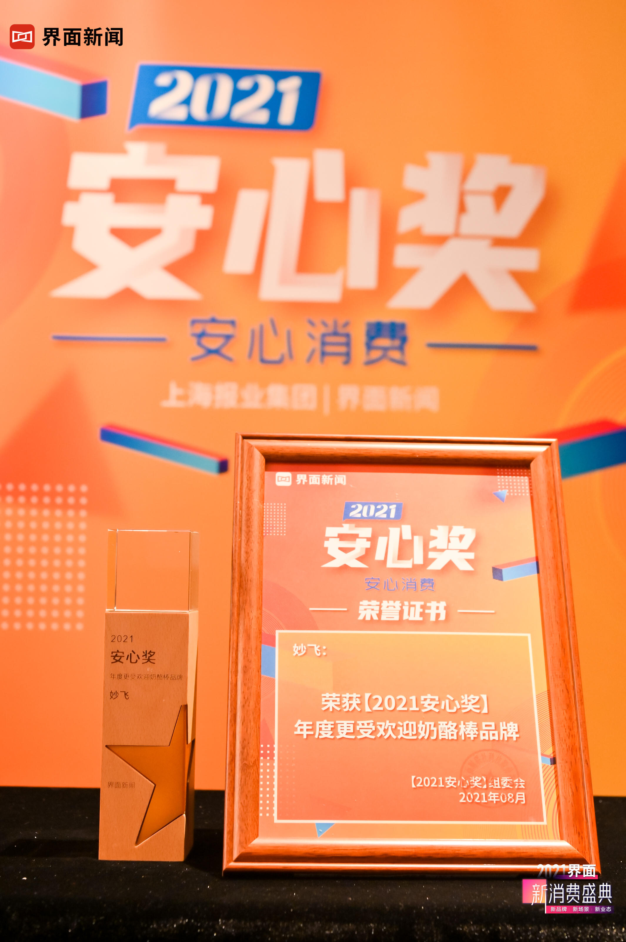 8月5日,上海報(bào)業(yè)集團(tuán)|界面新聞在上海靜安瑞吉酒店舉辦了【2021安心獎(jiǎng)】頒獎(jiǎng)典禮。妙飛憑借其牢固的食品安全防線和精益求精的研發(fā)態(tài)度,榮膺年度更受歡迎奶酪棒品牌。